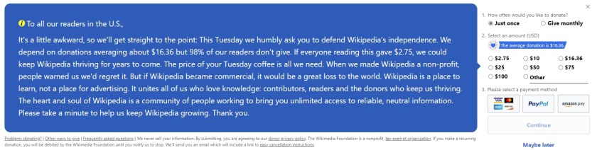 So, why I never give Wikipedia any of my money:
